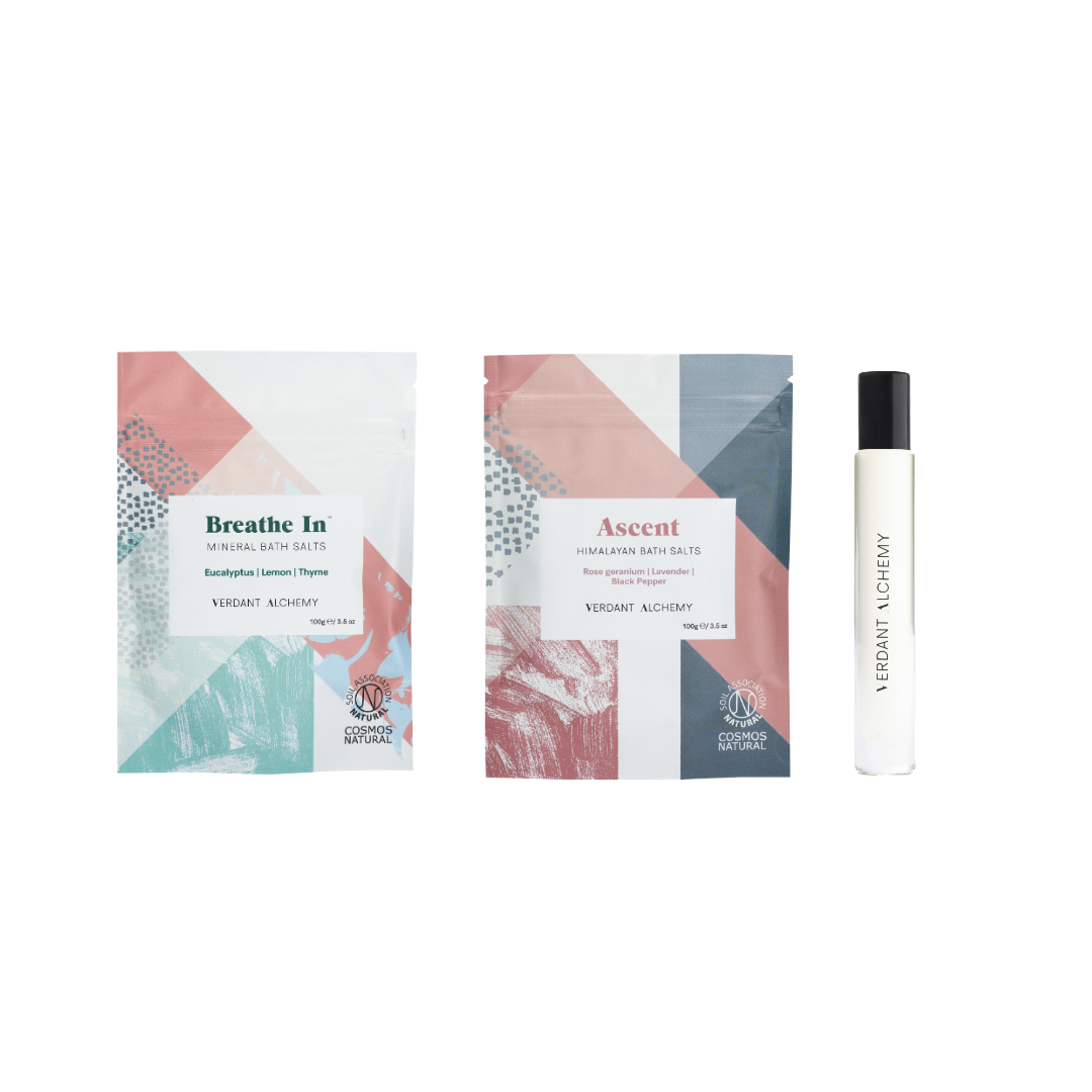 The bundle features Ascent Pink Himalayan Bath Salts, Breathe In Mineral Bath Salts, and the Fleurscape Aromatherapy Roll-On — three complementary aromatherapy products designed to uplift the mind and body.
